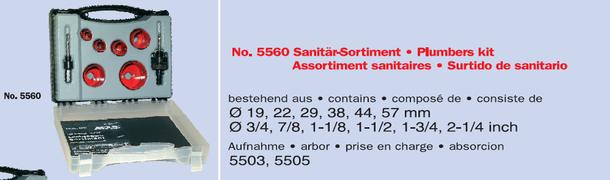 inkl. Lochsägen je 1 x 19, 22, 29, 38, 44, 57 mm